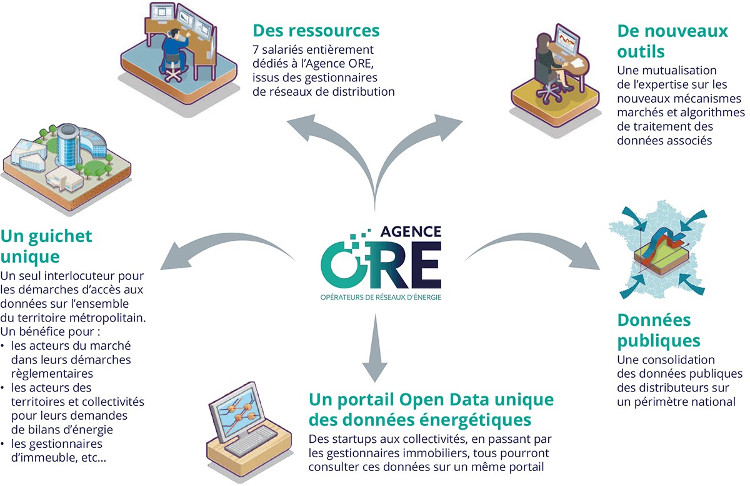 L’initiative s’inscrit dans la continuité des préconisations de la CRE concernant l’organisation et la gouvernance des données de l’énergie. L’agence est implantée au Blue Office, un espace de co-working à Paris. 7 salariés issus des gestionnaires sont entièrement dédiés à l’Agence ORE.