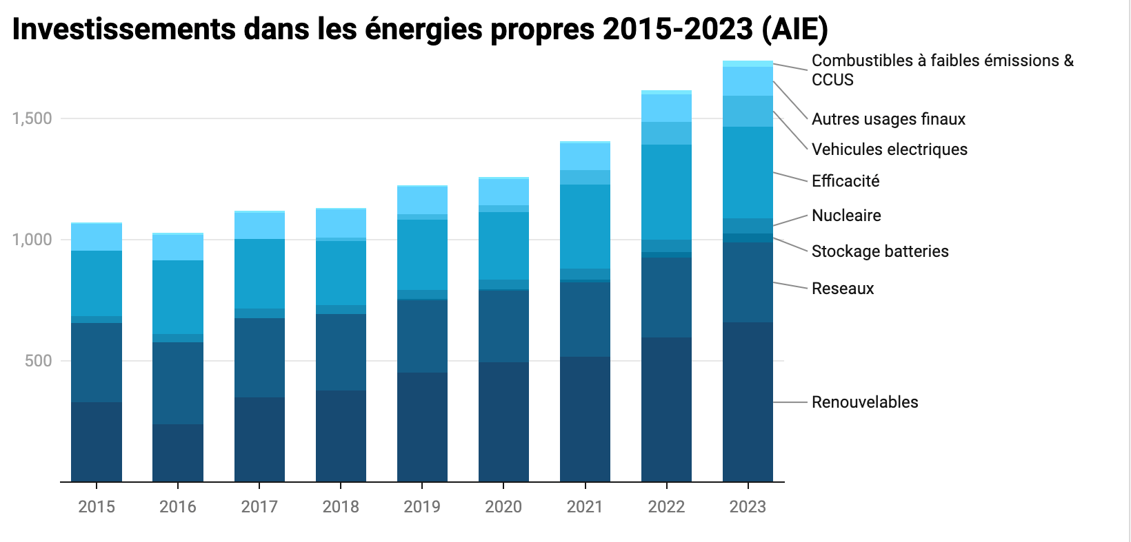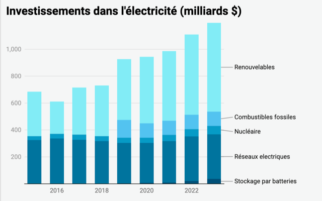 Selon l’AIE, la reprise après la pandémie et la réponse à la crise mondiale de l’énergie ont fortement stimulé les investissements mondiaux dans les énergies propres, avec une croissance de 24 % entre 2021 et 2023 contre 15 % dans les combustibles fossiles. Les énergies propres ont mobilisé en 2023 1 740 milliards $ contre 1000 milliards $ pour les énergies fossiles. « Pour chaque dollar investi dans les combustibles fossiles, environ 1,7 dollar est maintenant investi dans les énergies propres. Il y a cinq ans, ce rapport était d’un pour un ».