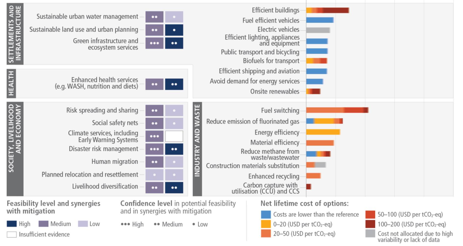 Parmi toutes les solutions de réduction des émissions jugées techniquement viables et rentables, le GIEC mentionne le solaire, l’éolien, l’électrification des systèmes urbains, l’infrastructure verte urbaine, l’efficacité énergétique ou encore la maîtrise de la demande. La baisse drastique du coût des énergies renouvelables solaires et éoliennes et des batteries lithium-ion ont permis d’accélérer leur déploiement. Dans certaines régions et certains secteurs, le maintien de systèmes à forte intensité carbone peut ainsi s’avérer plus coûteux que la transition vers des systèmes à faibles émissions.