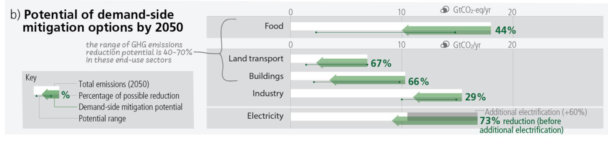 Les flèches vertes représentent les potentiels de réduction des émissions de GES grâce aux mesures axées sur la réduction des consommations. Ainsi, les émissions mondiales de GES des bâtiments, des transports terrestres et de l’alimentation pourraient être réduites de 40 à 70 % d’ici à 2050 par rapport aux scénarios de référence.
