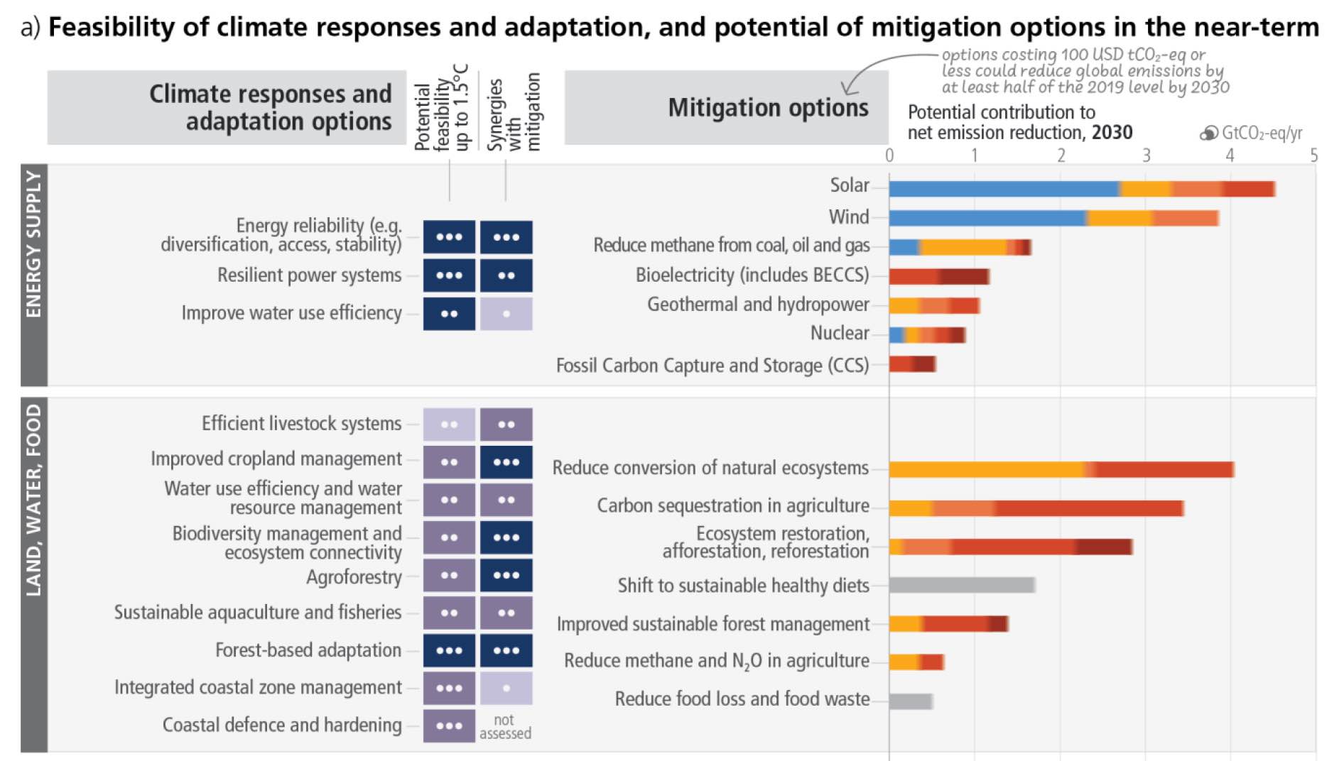 À droite du tableau, où sont listées les options pour atténuer le changement climatique, on constate que l’éolien et le solaire font partie des solutions les plus efficaces pour réduire les émissions mais aussi des plus rentables. Les solutions d’efficacité énergétique ou permettant d’éviter des consommations d’énergie sont aussi généralement rentables ou avec un surcoût peu élevé. Sur la colonne de gauche, qui concerne le volet « adaptation » au changement climatique, renforcer la résilience du système électrique et sécuriser l’approvisionnement en énergie font partie des principaux leviers à actionner pour leur efficacité, leur faisabilité, ainsi que pour leurs fortes synergies avec la dimension atténuation des émissions. Les trois points sur le pavé indiquent en outre un « haut niveau de confiance » du GIEC sur ces aspects.