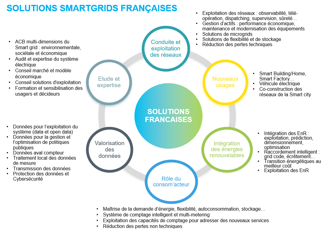 Les technologies développées par la filière française des smart grids concernent aussi bien la production et le transport d’électricité que sa distribution et sa consommation.