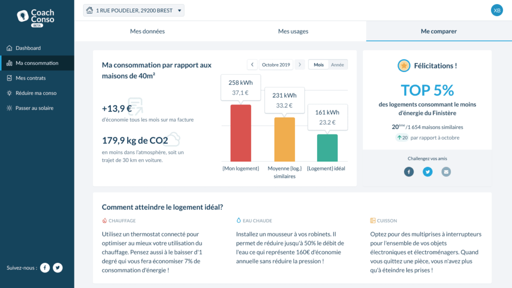 Le Coach Conso est un outil pour suivre gratuitement sa consommation électrique en ligne. Grâce à une interface web ou une application mobile, le client peut suivre les performances énergétiques de son logement, comparer sa consommation avec celle de logements similaires et recevoir des conseils pour réduire ses factures.