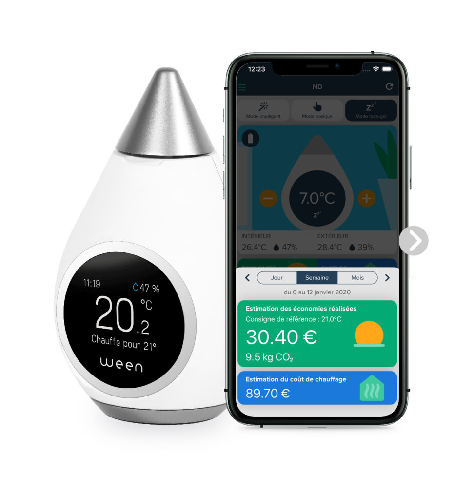 Ween est un thermostat connecté qui aide les clients à maximiser les économies d’énergie, en contrôlant le chauffage du logement. Il s’adapte en temps réel à la situation et est capable de reconnaitre la présence des clients au domicile. La solution permet également suivre la consommation des clients en temps réel. Les données sont sécurisées car stockées uniquement dans le thermostat Ween.